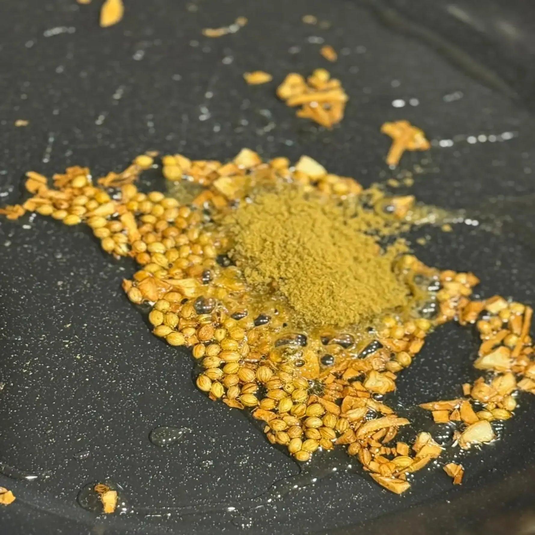3.弱火でフライパンにオリ-オイルを引き、コリアンダーシード(1g)、ニンニクとチリを加える。