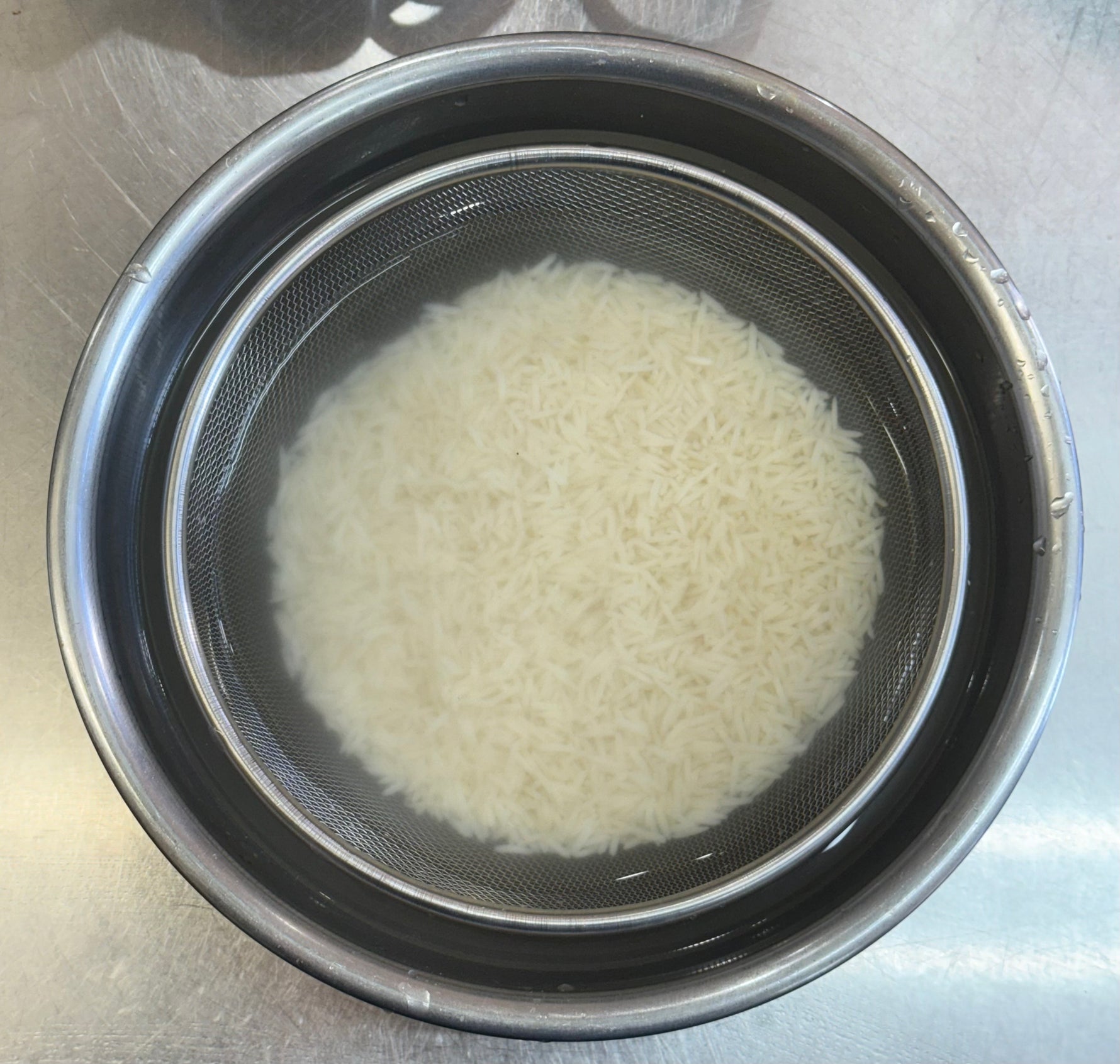 3. 浸水したバスマテイライスを水を切って、鍋に2L水を入れます